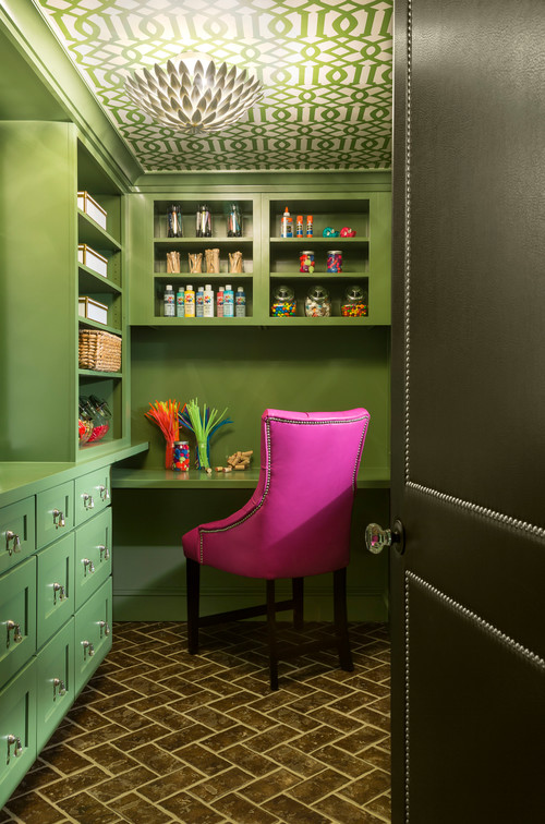 If you were wondering about a desk surface, consider this simple design. The chandelier, geometric ceiling pattern, and bright green cabinets are a clear indicator that you can have fun with a pantry decor.