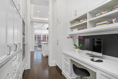 Another desk located near a pantry. In terms of kitchen layout, not all kitchens can afford an integrated pantry in the kitchen footprint. It only makes sense that a pantry and pantry desk are tucked away into a quieter nearby kitchen corner.