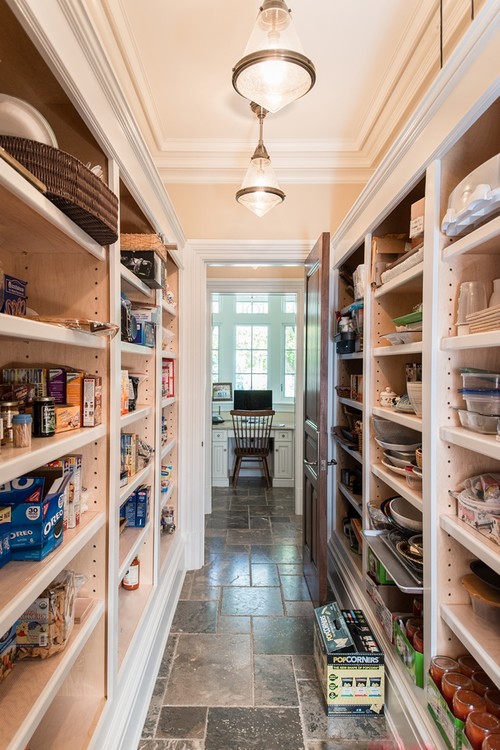 A desk is at the helm in this pantry/desk combo. Although outside of the walk-in pantry, the desk has found a quiet spot with it’s own view out a window. What a nice spot to figure out your next hot dish!