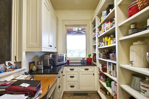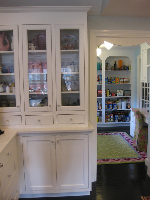 Notice the stepping down to desk level in this pantry. In addition, the pantry space is differentiated with a warm, wood top.