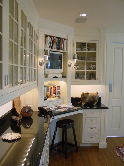 Looking past the china hutch, you can just see a desk sharing pantry space in the room beyond. The room is big enough so that the desk is a piece of furniture by itself. Many of the examples on the page have shown built-in desks, simply because of space limitations.