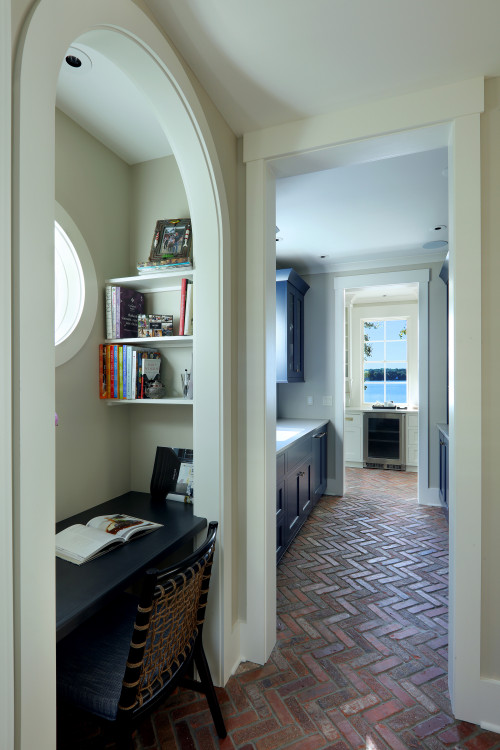 This pantry desk was elevated to its own private nook. Perhaps the homeowner needed more privacy and quiet further away from the kitchen. Either way, it is a beautiful detail that pairs nicely with the brick floor.