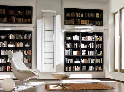 It’s true, not all “library ladders” have wheels. In this sleek and modern design, the ladder may have been custom made, maybe the owner didn’t much care for wheels. Safety is a significant part of owning a library ladder, it’s difficult to see from this picture if the ladder is attached at the top and how stable the base of the ladder is for the user. Library ladder wheels have mechanisms to prevent the ladder from moving. Although the narrow rungs add to the minimalist design, from a safety standpoint, they could be improved to be wider to offer more stability for the user.